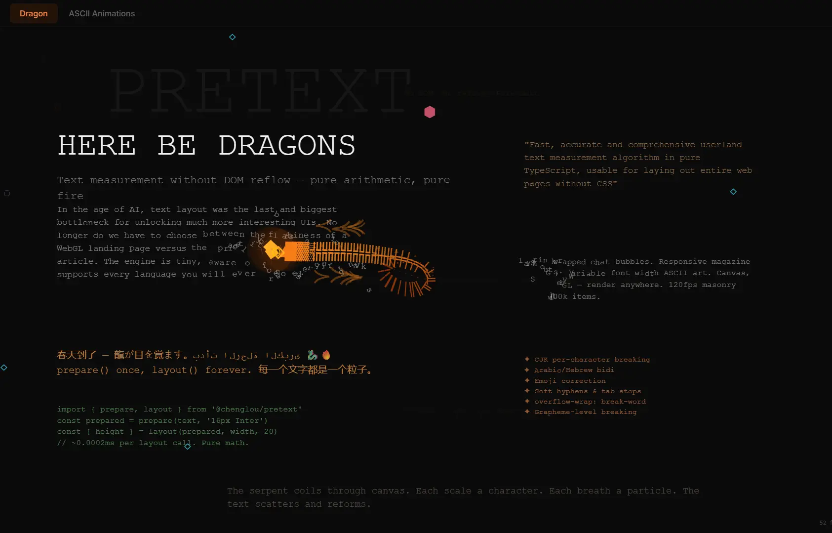 Pretext is a pure JavaScript/TypeScript library for multiline text measurement and layout — built by Cheng Lou, the same person behind react-motion and ReasonML.