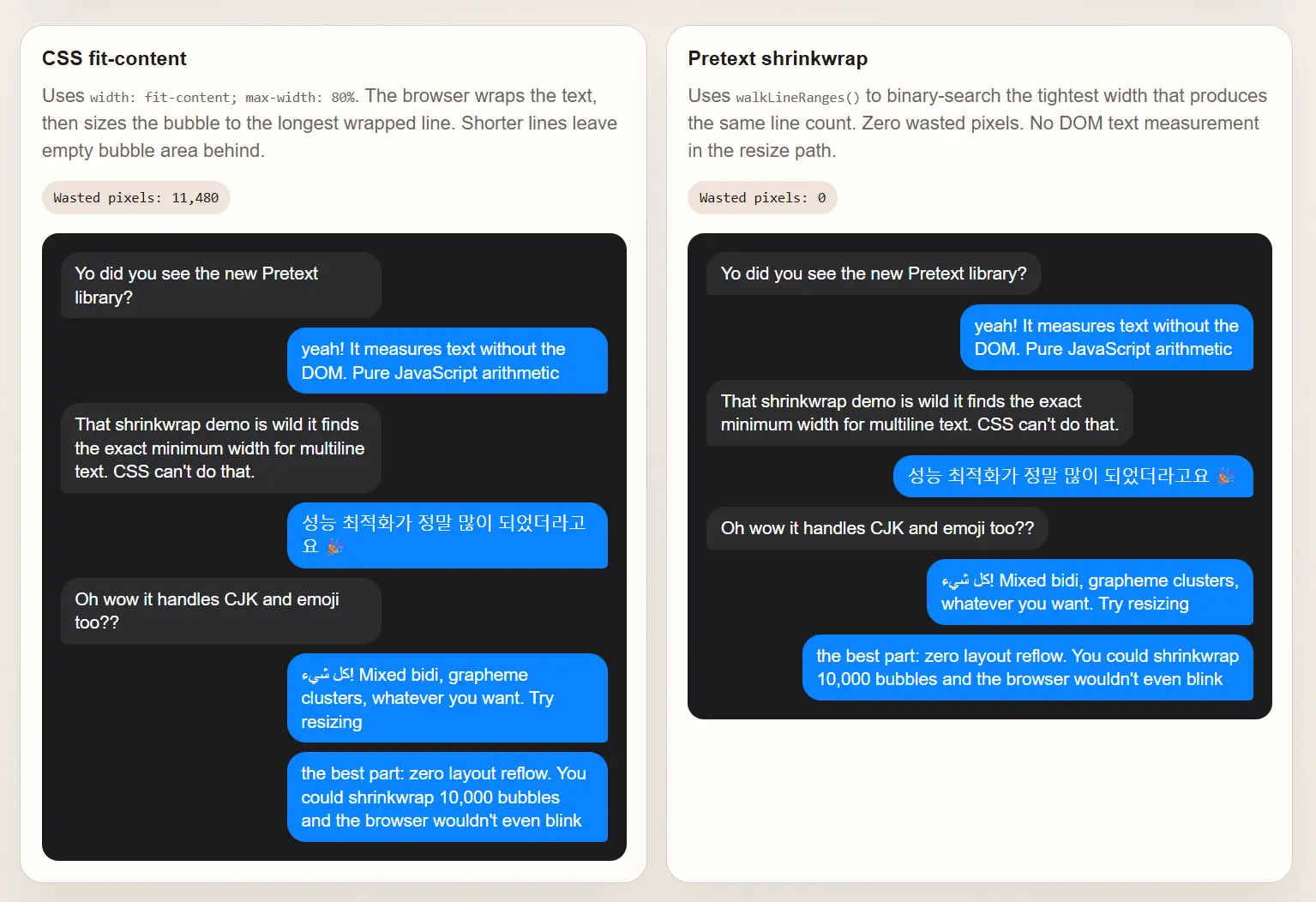 Pretext’s insight is clever: canvas.measureText() uses the exact same font engine as DOM rendering — but operates completely outside the browser’s layout process. No reflow. No pause. Just math.
